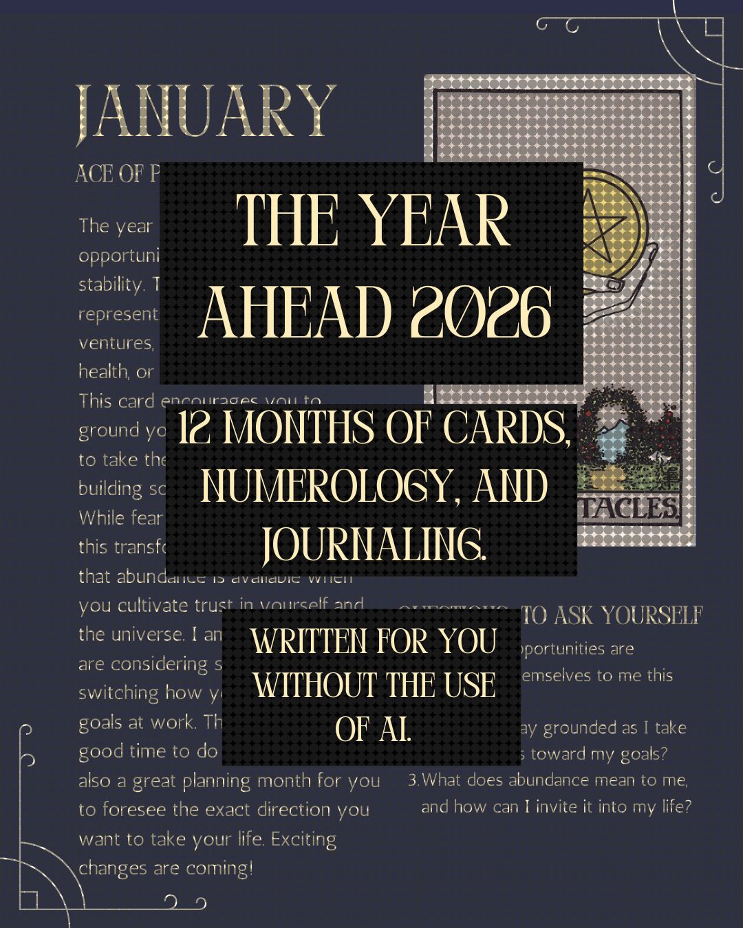 You receive: A Quarterly Oracle Card Theme, a Monthly Tarot Card with description and journal prompts, two Fifteen Minute Readings for clarity throughout the year, a full page Numerology Report for themes to expect in your year, and a distance reiki session you can redeem by texting us on the business line when you need it most. All written by humans, never AI. This is a very time consuming project, so limited numbers are available.
