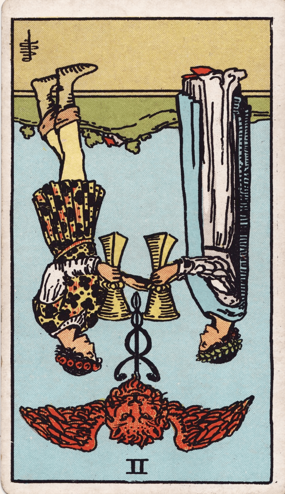 The Two of Cups (Inverted). The Two of Cups when upright is a card about harmony and the bringing together of two energies. When reversed, it can indicate that two energies are at odds with each other—how apropos for both the theme of shadow work and the situation we find ourselves in as a nation. Reversed, this card holds the energies of arguments, divorce, not seeing eye to eye, conflict, and yes, war. A few other cards here would indicate mutual annihilation, but the suit of cups is rooted in emotions and healing. Paired with the Page of Wands, there is hope for a rebirth, or reconciliation.